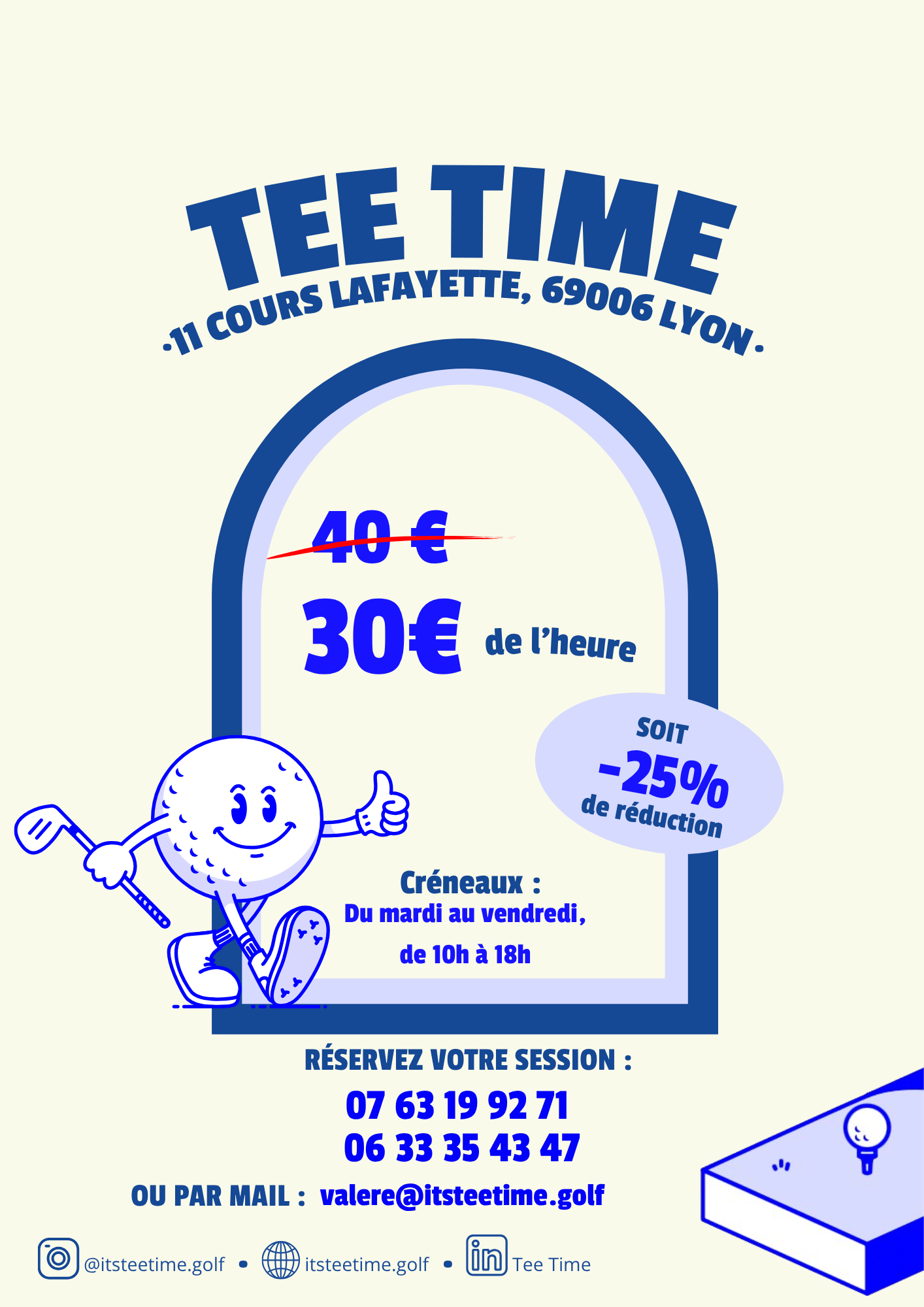 Une réduction de 25 % est accordée par notre partenaire TEETIME au adhérents de l’ AS GOLF GRAND PARC sur l’heure de simulateur en heures creuses (soit 30 € au lieu de 40€)